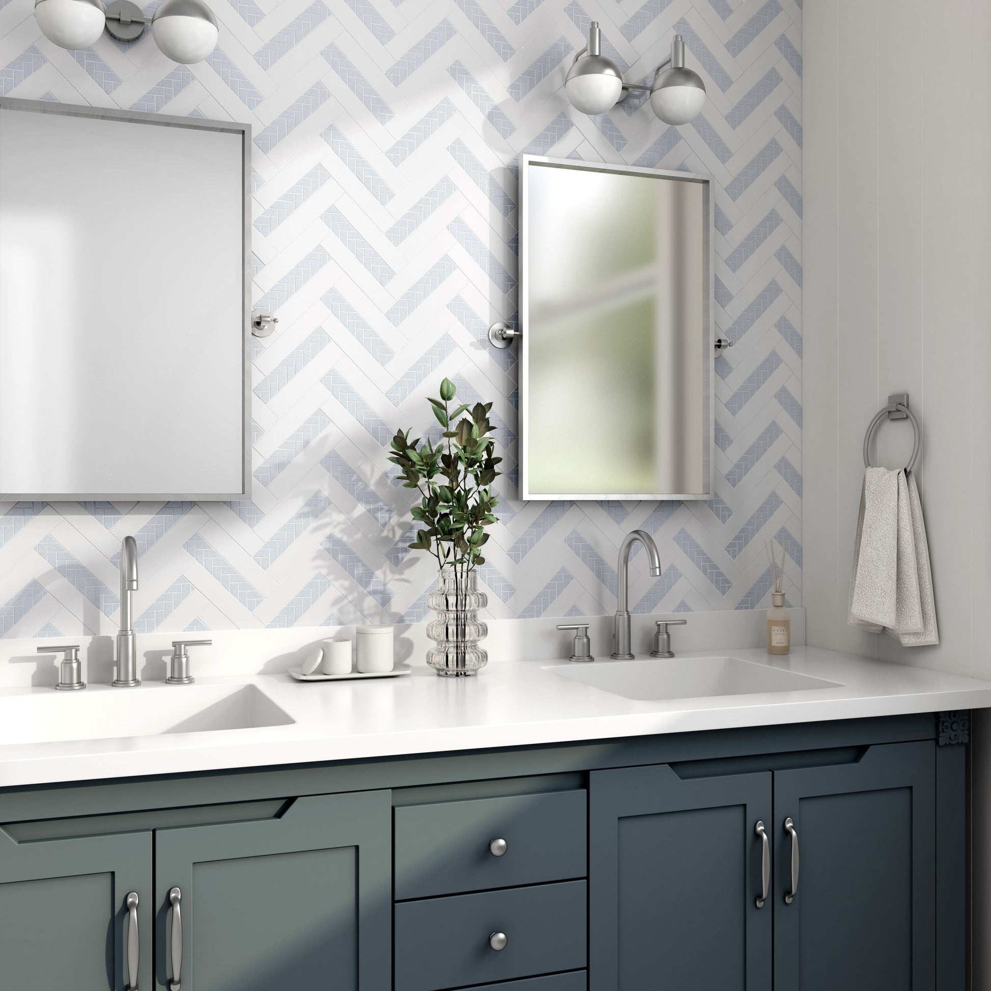 Meet Argent! A hand-cut herringbone marble mosaic with an intricate micro herringone inlay that adds character and style to any room as a floor tile or wall tile