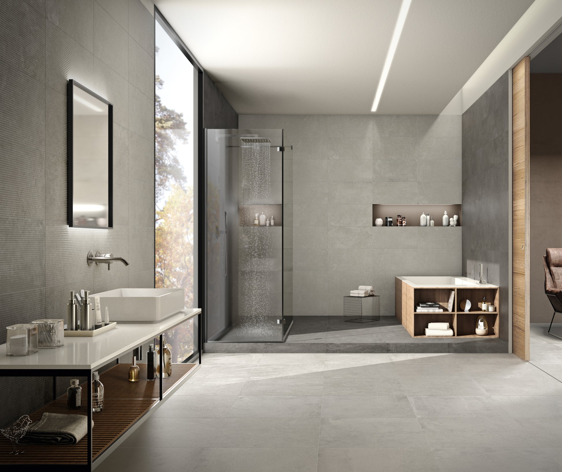 Meet Stonecrete! A stone-look large format porcelain tile that looks gorgeous as a floor tile or wall tile in any home or commercial space